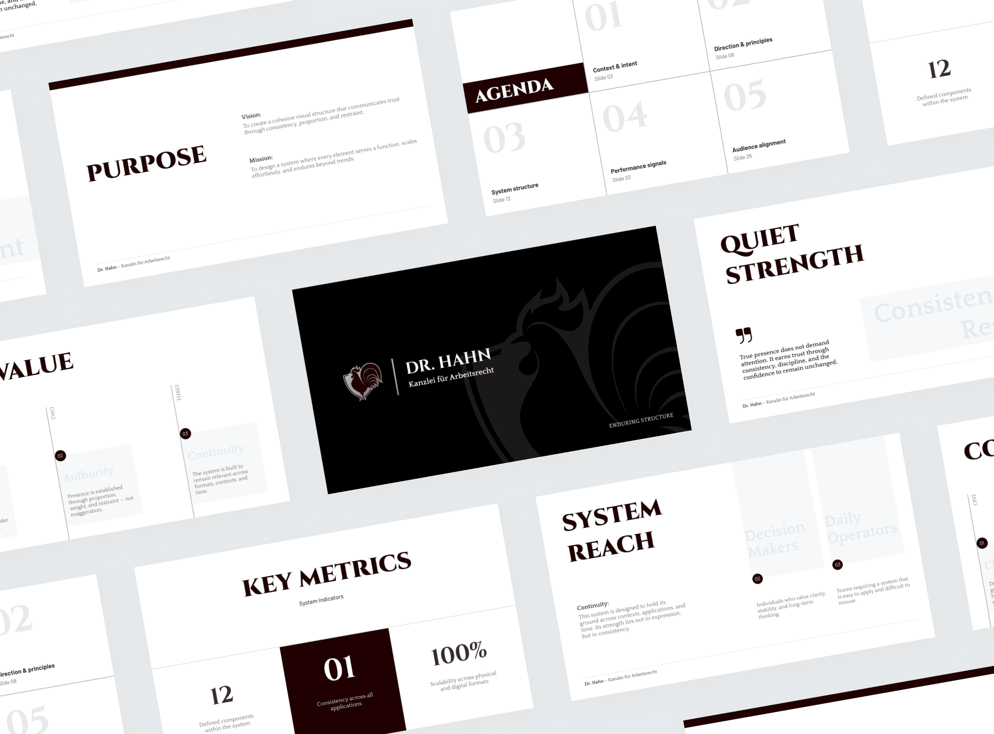 Dr. Hahn did not seek a rebrand. The brief was to carry forward a family symbol—the rooster (Hahn in German), while elevating it for a legal practice rooted in trust, authority, and continuity.