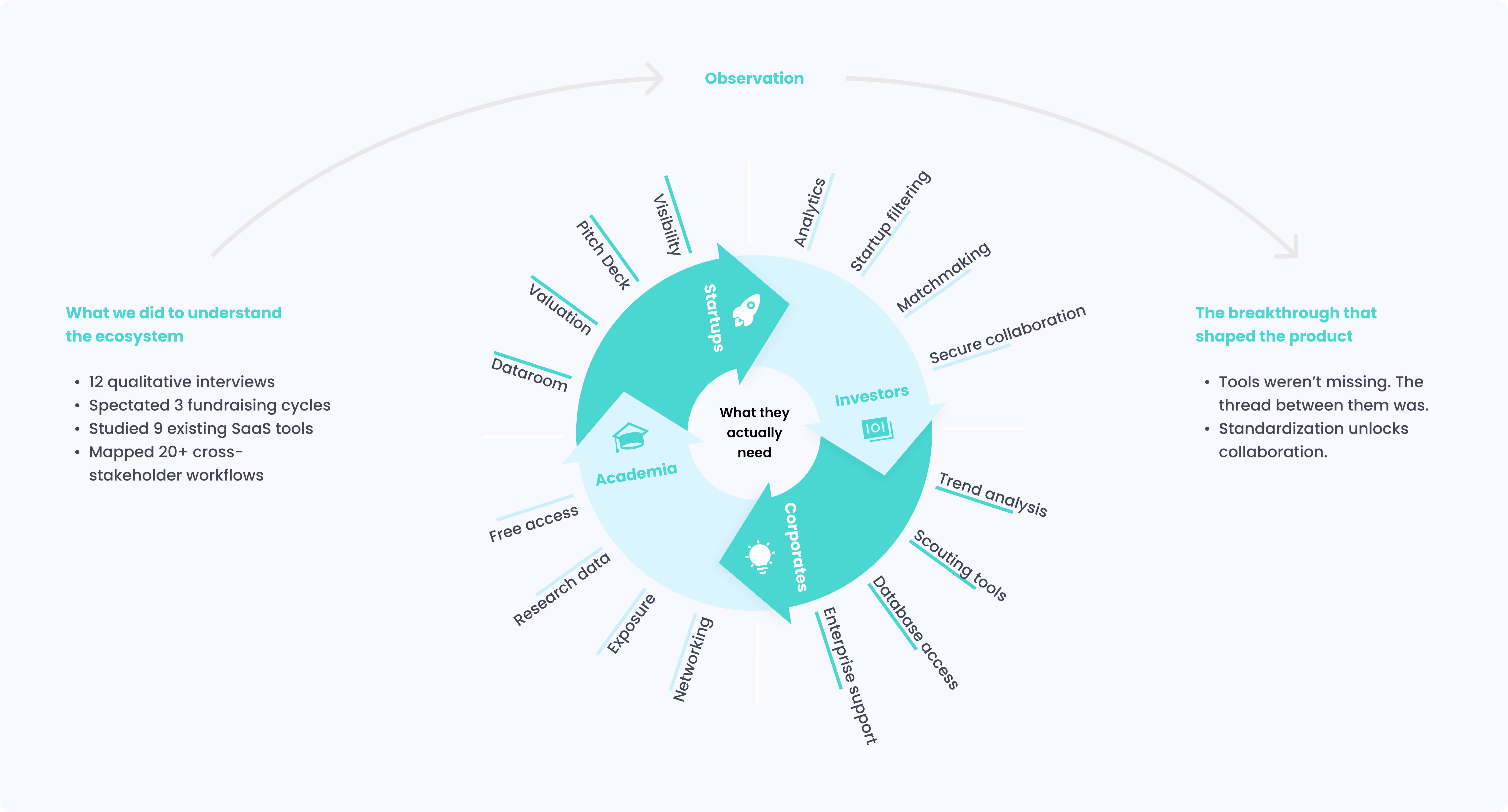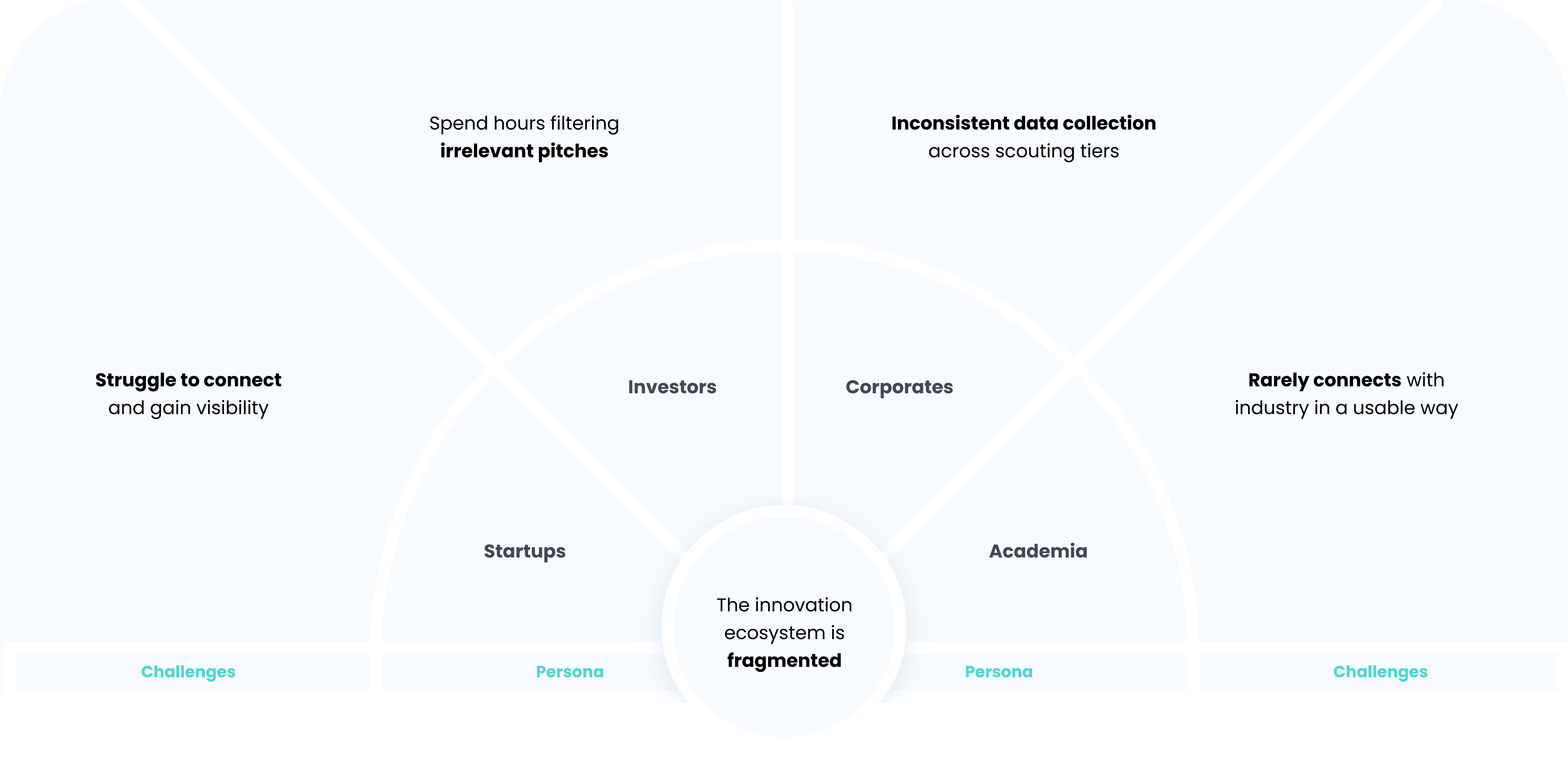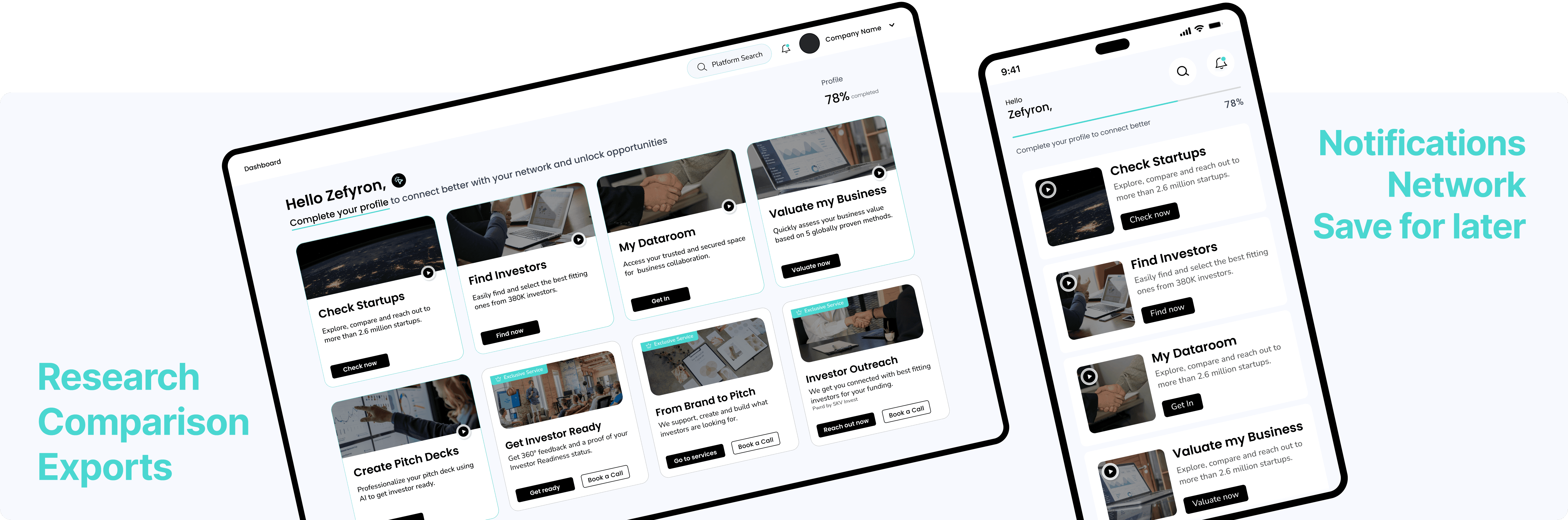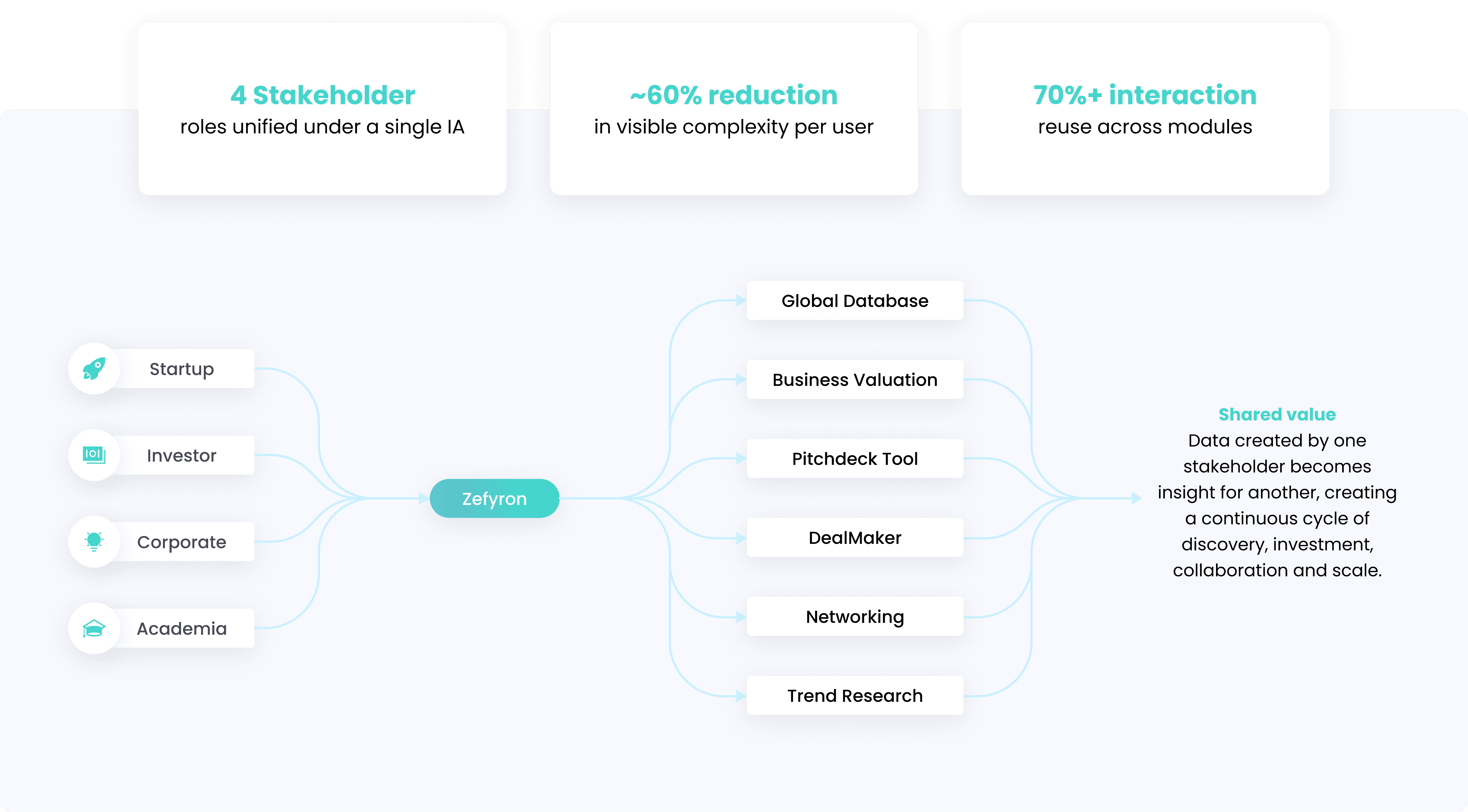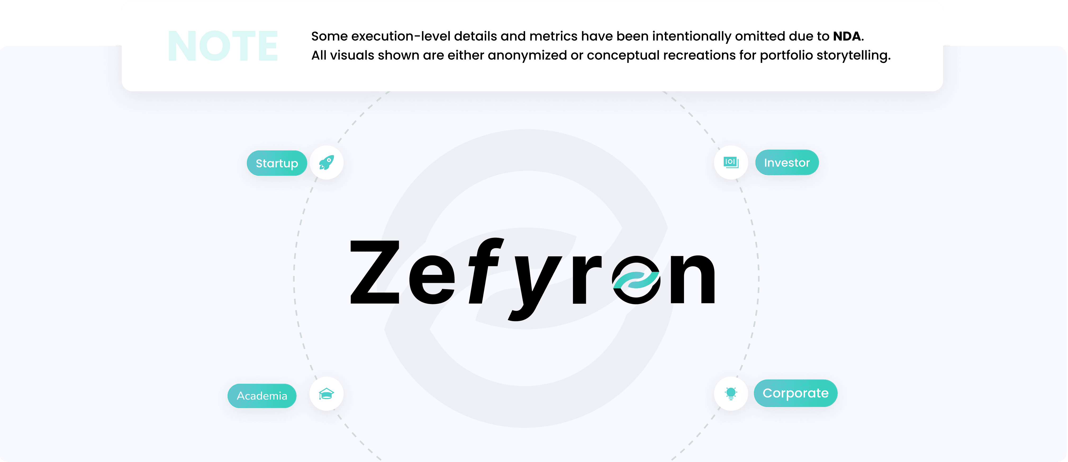 To solve the fragmented experience across fundraising, innovation, scouting, and research, we designed Zefyron as a single unified platform where startups, investors, corporates, and academia can network, collaborate and execute - all in one place.